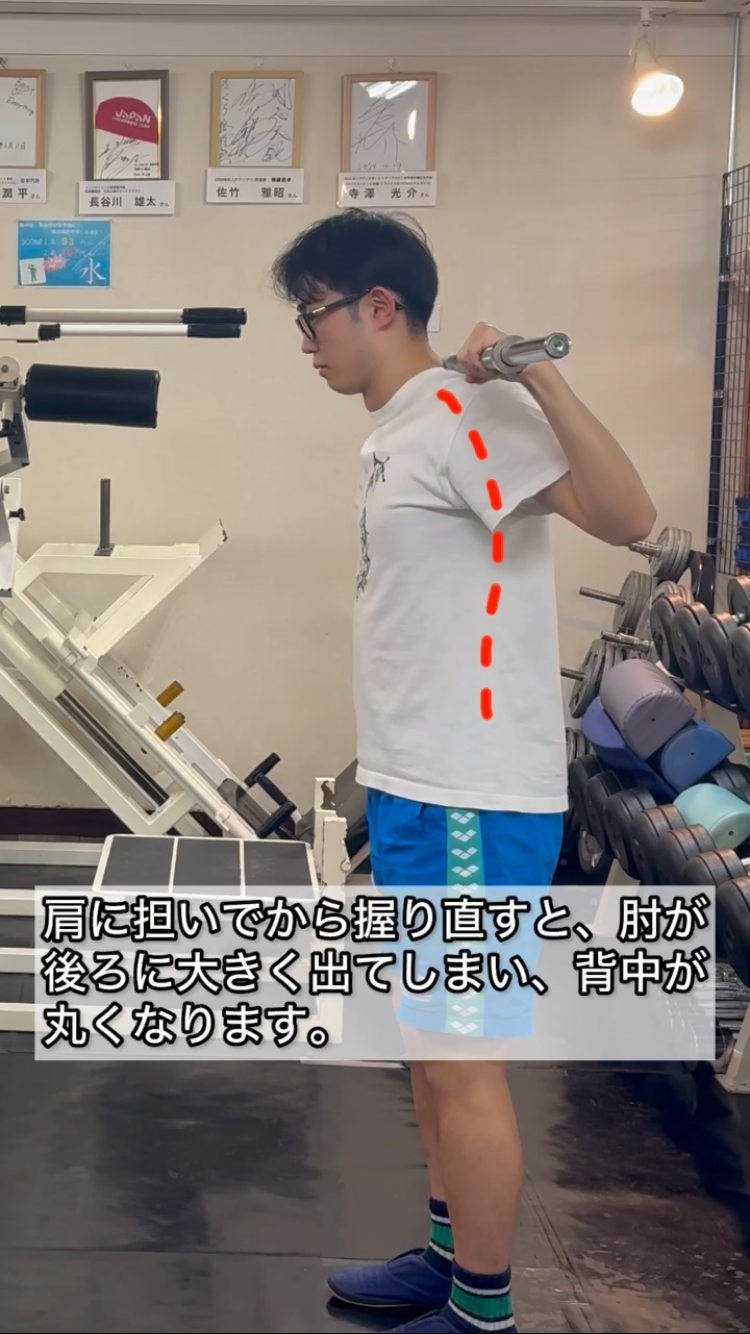 すなわち肩甲骨が背骨の方に、回転しながら寄り、ミゾオチが前に出るように背骨のアーチがしっかりと出された形でバーを肩に担ぐということです。