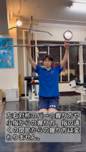 小指&末梢の関節からグリップしてバーを担ぐと、前腕が床と垂直で体幹と平行になり、胸椎(背骨)を起こしてきちんとしたアーチを形成してくれます。
